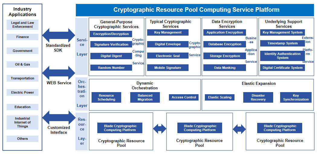The cryptographic resource pool provides consolidated cryptographic device management, unified key management, and integrated cryptographic computing services. By providing on-demand cryptographic service, it simplifies application system integration and ensures the compliance, accuracy, and effectiveness of cryptographic applications across diverse business scenarios. This enables the rapid construction of cryptographic networks and cryptography-enabled business application infrastructures.